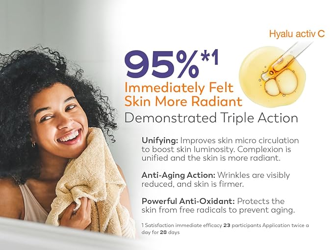 - OPTIMIZED VITAMIN C: 5 times more stable over time than pure vitamin C. This active form of vitamin C in the product is only released when it comes into contact with the skin. It thus remains more effective over time and more stable while in the packaging.