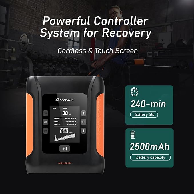 - ADVANCED LEG RECOVERY SYSTEM WITH COMPRESSION - With powerful cordless leg recovery system, QUINEAR air compression boots will offer a full-leg (include knees) massager therapy by inflating and deflating the sleeves sequentially with 4 air chambers to develop the circulating pressure on the leg, also used for squeezing and compress restless legs to promote blood circulation, lymphatic drainage, relieve muscle pain and tension from long workdays.