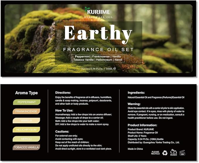 - Fragrance Oils Earthy Scents: This fragrance oil set includes a series of earthy, woodsy scents - Peppermint, Frankincense, Vanilla, Helichrysum, Neroli, Tobacco Vanilla aromatherapy oils. Each scent is carefully designed to create a inviting and pleasant atmosphere, bring a refreshing experience