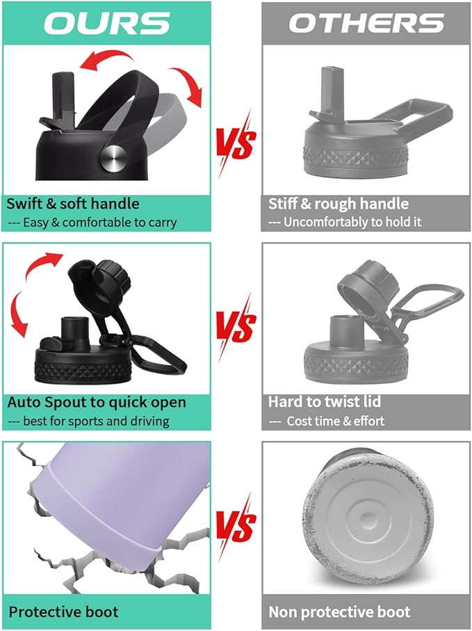- 2 LID OPTIONS (Auto-spout & Straw): two different lids are complete LEAK PROOF & design for easy drink. The pops-up lid for easy drinking and seals shut for no leaks when you're on the go. The straw lid makes it easy to enjoy spill-proof sips, and package come with a alternative straw & a straw brush for easy cleaning