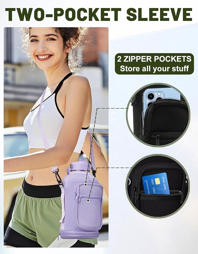 - PROTECTIVE BOOTS & STORAGE SLEEVE: Upgraded silicone boots prevent shattering and cracking when stainless steel water bottle accidental dropped. And storage carrying pouch with removable shoulder strap for convenient hands free carrying! The safe zippered pocket design to stores all your stuff, holds your cards & phone & key