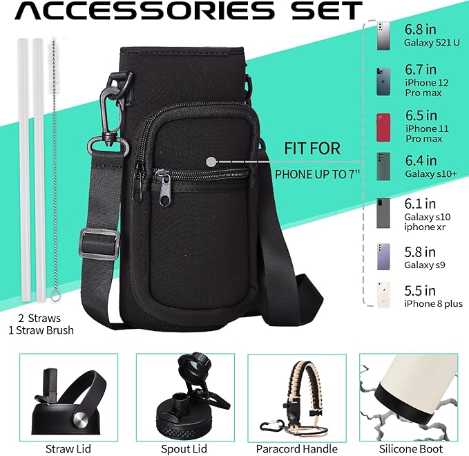 - COMBO—Super Deal: Buy 40oz stainless steel water bottles and get 9 accessories (2 x lids, 1 x survival paracord, 1 x carrying pouch, 1 x shoulder strap, 1 x protective cup mat, 2 x straws, 1 x straw brush). WITH A LIFETIME GUARANTEE, these thermal water bottles are the perfect gift for use at home, work, school, road trips, hiking, sporting events, or just hanging out