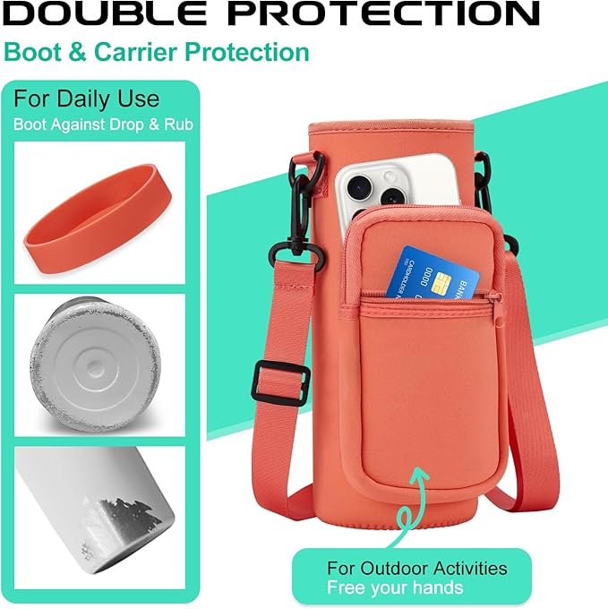 - PROTECTIVE BOOTS & STORAGE CARRIER BAG: Upgraded silicone boots prevent shattering and cracking when stainless steel water bottle accidental dropped. The storage carrying pouch made with neoprene material provide extra protect & insulation for your travel water bottle, 2 zippered pockets design to stores cards, keys and phones of any size.
