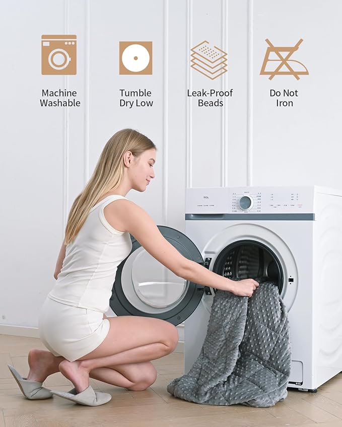 - Easy Care & Durable: Our weighted blanket is designed for effortless maintenance. It's machine washable and can be tumble dried on low heat. Its multi-layered structure holds the glass beads in place and prevents leakage. Enjoy peace of mind with our 12-month guarantee.