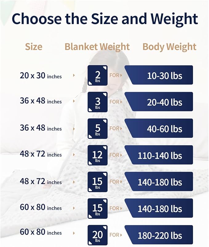 - Choose the Right Size and Weight: We recommend a blanket that is about 10% of body weight. Our carefully selected weights of 2 lbs, 3 lbs, 5 lbs, and 7 lbs are suitable for different age groups of 30-40 lbs, 41-60 lbs, and 61-85 lbs respectively. For taller individuals, a larger 7lbs blanket is recommende