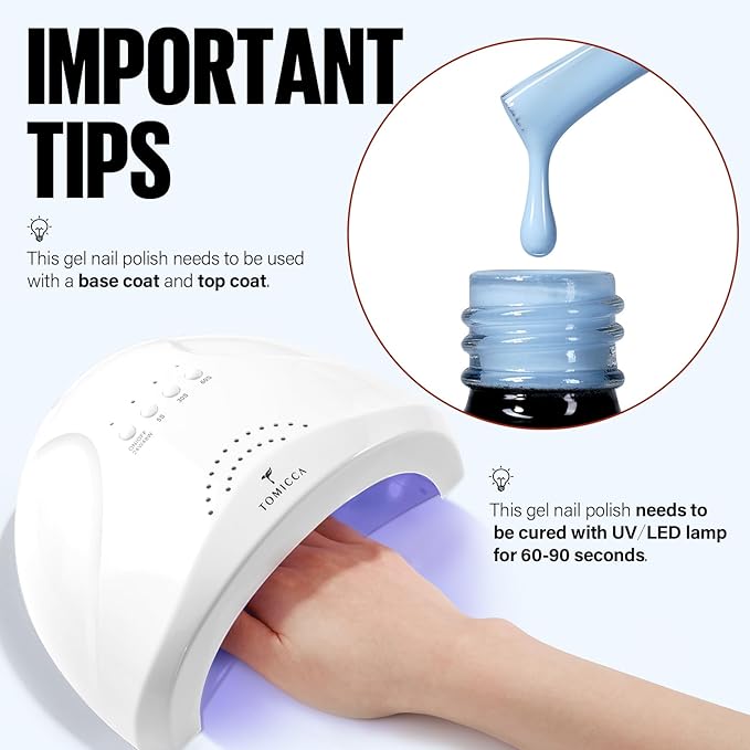 - 【Natural Vegan & Multiple Use】: Our cotton candy blue nail polish gel is made from natural resin, with the latest technology to keep our products in strict compliance with SGS standards and contains no harmful ingredients. Which makes it safer for your nail beds, even for pregnant women. TOMICCA will maintain lasting and professional service for you