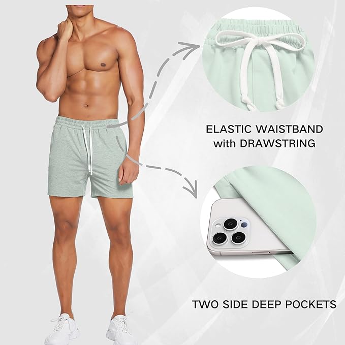 • 【Lightweight & Breathable】The men's soft sleep shorts are 70% polyester 25% cotton and 5% spandex. Stretchy and lightweight jersey fabric with quick-dry technology make the sweat shorts comfortable and stress-free during workouts and other activities.