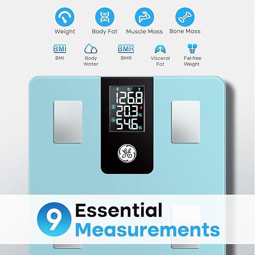 - Comprehensive Health Metrics Analysis: The GE Fit Plus Smart Body Fat Scale conducts in-depth assessments of nine crucial health indicators, including body weight, body fat percentage, muscle mass, body water, visceral fat, fat-free body weight, BMI, BMR, and bone mass. It effortlessly sends this data to your smartphone via Bluetooth, helping you meet your health goals with precision