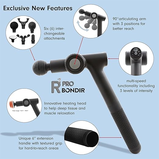 R2pro Massage Gun with Heated Head, 6X Heads, Extension Handle, Articulating Arm - Powerful High Intensity Deep Tissue Massager for Back, Neck, Legs, Whole Body, Muscle Recovery, Rechargeable