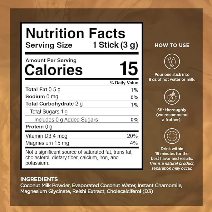 - NATURE'S GIFT: We've chosen only the finest plant-based ingredients for this blend. Our sleep tea is a vegan medley of chamomile, coconut milk, magnesium, potassium, vitamin D3, reishi mushroom, and coconut water. It combines the herbal goodness of chamomile tea with the restorative power of electrolytes for a night of rejuvenating sleep.