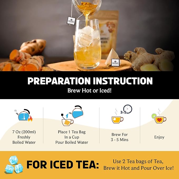 - TURMERIC AND GINGER FROM INDIA: Our blend is made using turmeric and ginger from the farms in India. The tea can be made hot or cold depending on preference. The ginger root provides a delicious aroma to the tea while the turmeric boosts the taste profile. Delightful fusion of earthy turmeric and spicy ginger flavors, perfect for a warming and comforting beverage. Convenient and easy-to-use tea bags for hassle-free preparation anytime, anywhere.