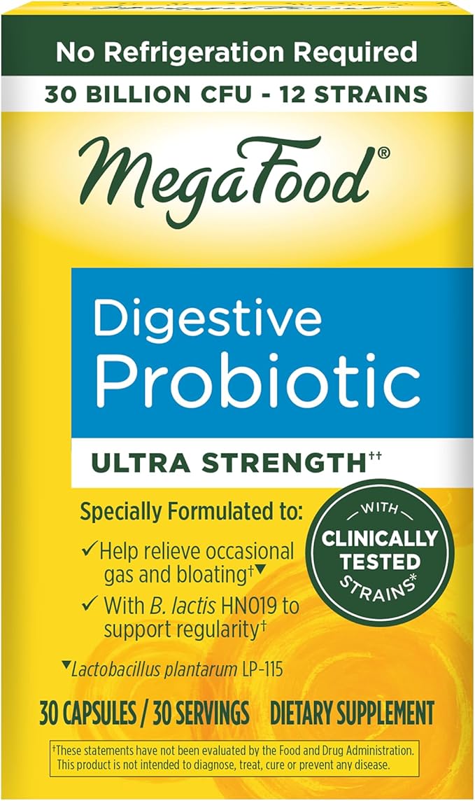 - ADVANCED DAILY DIGESTIVE CARE: Support regularity & help relieve occasional bloating with MegaFood Digestive Probiotic; Offers 30 billion CFUs and a blend of 12 probiotic strains per serving, including clinically tested strains+