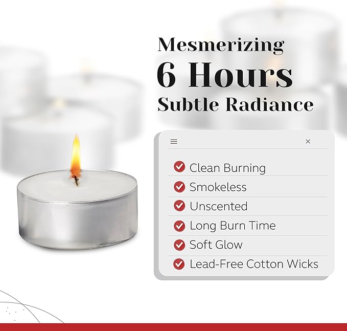 - Shine Brighter, Burn Longer: Delight in the cozy warmth and light of our long burning candles made from wax and lead-free cotton. These tea candles offer continuous, steady flame for 6 hours — no need for frequent relighting or unexpected darkness.