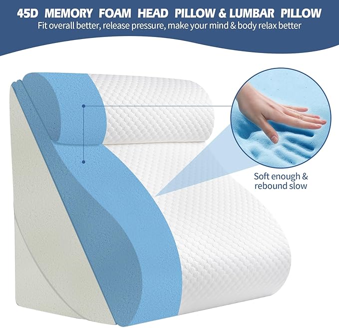 - Unique 6 Piece Wedge Pillows with Lumbar Support Pillow: The biggest difference the 6-piece orthopedic bed wedge pillow and others on the market is that there’s an adjustable lumbar pillow which is a whole memory foam waist pillow, can be used to elevate & support head, waist or hips. 6pcs pillow wedge set will provide you comfortable sleeping, support various needs for overall body stress relief and body elevation. Super value 6pcs include base pillow, back pillow, head pillow, lumbar pillow and 2pcs leg pillow