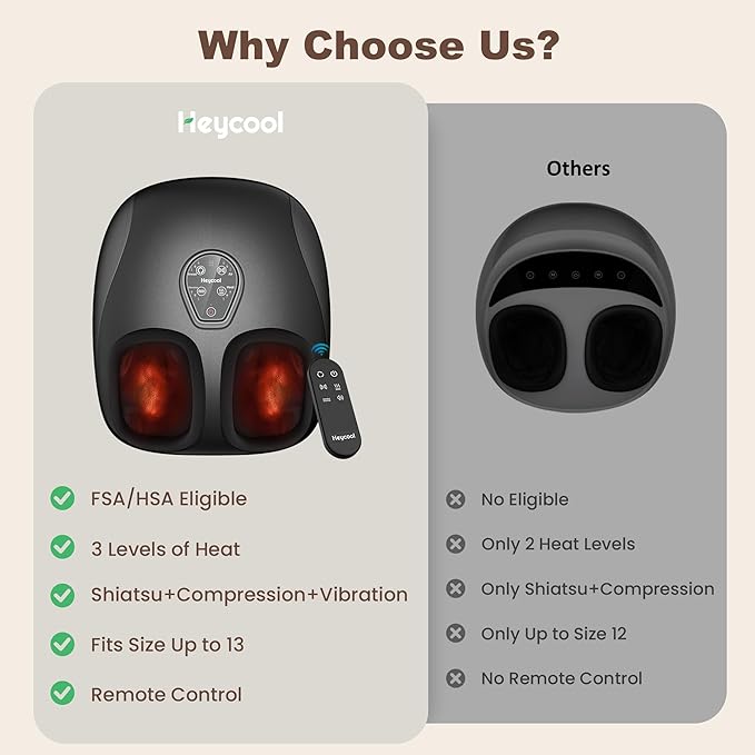 - Relax your feet, relax your whole body.: The Heycool shiatsu foot massager combines heating, compression, and vibration rolling to provide a comprehensive and wonderful massage for your feet, helping to relieve plantar fasciitis and neuropathic foot pain. HSA eligible products
