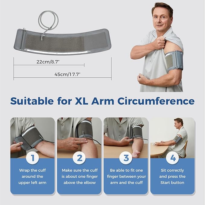 - Adjustable XL Cuff - Our blood pressure machine has a wide-range D-ring cuff that fits 8.7”-17.7”(22-45cm) adult arm, suitable for XL arm circumference