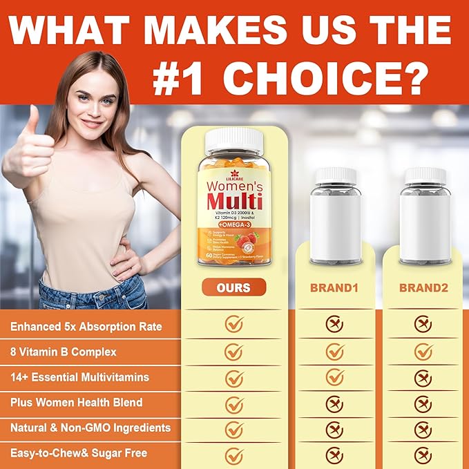 - Comprehensive Vitamin to Fill Nutrient Gaps: Our women's multivitamin gummies are packed with 20+ essential vitamins, minerals, and nutrients to support overall health and wellness. Including biotin and inositol for skin, hair, and nail health; Vitamin D3 and K2 for bone and teeth health; Omega-3 for hormone balance, brain and eye function; and B complex for an energy boost and m♡♡d support. It’s a feel-good formula your body will love!
