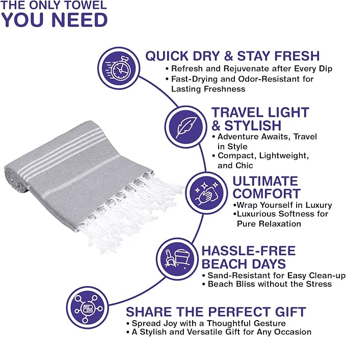 - TRAVEL LIGHT, DRY FAST: Elevate your travel experience with our refined Turkish towels. Thinner than standard terrycloth yet equally absorbent and astonishingly compact, they slide easily into any bag. Perfect for post-shower or beach use, our towels merge a space-saving design with reliable absorption, ensuring comfort during every adventure.
