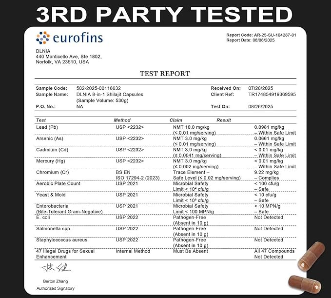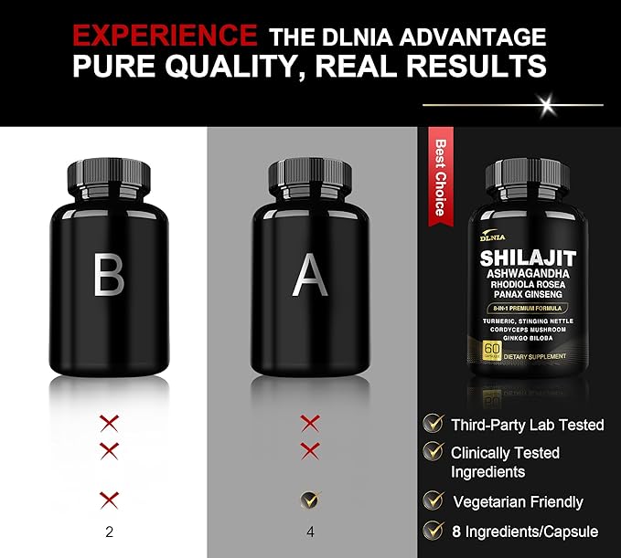 - ๐ชSATISFACTION GUARANTEE WITH EVERY CAPSULE: Harvested from the ancient Himalayas & meticulously blended with 7 potent, natural ingredients, our DLNIA 8-in-1 Shilajit Supplement is proudly formulated, tested, & certified here in the USA; we hold our product to the highest standards of quality, & efficacy; Your Health & satisfaction are our priorities, so rest assured that our shilajit premium capsules are free from impurities & preservatives