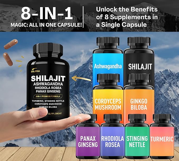 - ๐ชTRANQUIL NIGHTS & VIBRANT MORNINGS: Discover the secret to wakeful mornings & restorative sleep with DLNIA all-in-one supplement shilajit pure Himalayan organic capsules; The blend of Turmeric, Cordyceps Mushroom, Stinging Nettle with Himalaya Shilajit for women & men boost energy, improve immunity ; A single solution to all your supplement needs