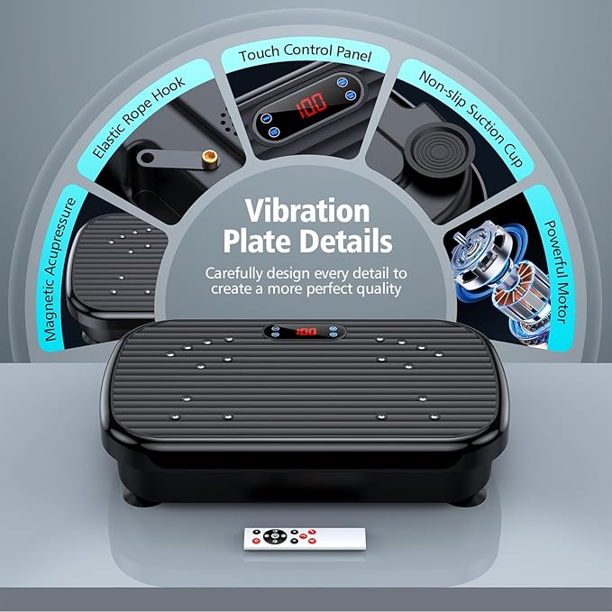 - Easy to Use and Store: Operate the vibration plate in two ways: with the included remote control or via the LED touch screen, the display allows you to see the time and speed for a clear view of your workout; Anti-slip coated design, impact-resistant ABS housing ensures the longevity and protection of the motor. Compact size, can be used anywhere, space saving, easy to carry and store