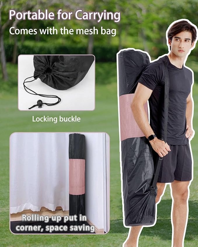 - Easy to Clean and Store: Waterproof design, easy to clean, suit for both indoor and outdoor activities. Comes with a meshed carry bag, 2 elastic band straps(inside of the rolled mat), easy to roll up and store.