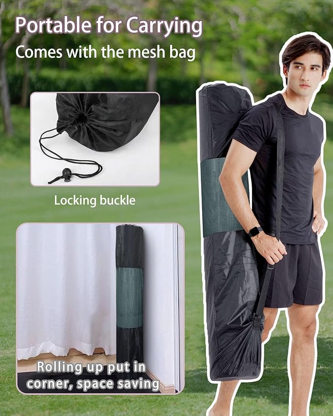 - Easy to Clean and Store: Waterproof design, easy to clean, suit for both indoor and outdoor activities. Comes with a meshed carry bag, 2 elastic band straps(inside of the rolled mat), easy to roll up and store.