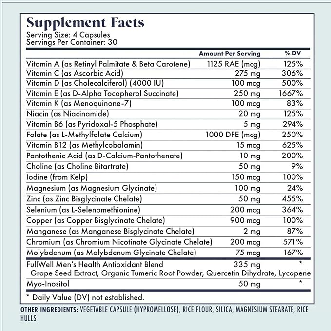 FullWell Men's Daily Multivitamin with Vitamin D, Antioxidants, Choline, and B Vitamins for Optimal Sperm Quality, Hormone Health, and Overall Male Fertility, 3rd Party Tested, 30 Servings