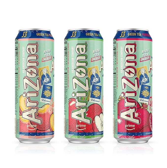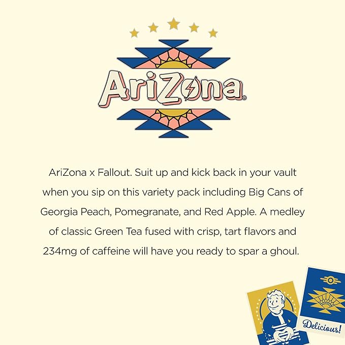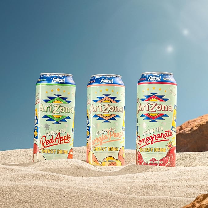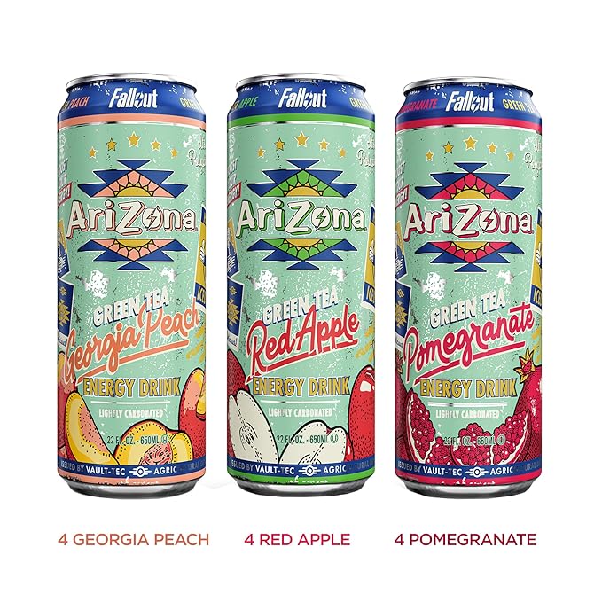 - Includes twelve of 22 fl oz cans of AriZona x Fallout Green Tea Energy Drink Variety Pack - 3 different flavors, 4 cans per flavor