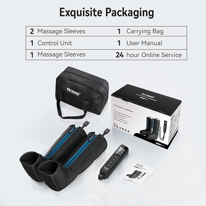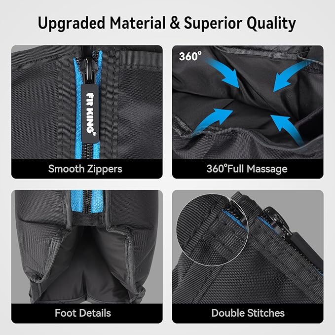 - 360° Air Compression Therapy: Crafted with a large air pump, FIT KING Compression Boots deliver dynamic 360° air compression for your calves and feet. They simulate human hands kneading and orderly squeezing massage to effectively boost circulation, help relieve leg pain, cramps, restless leg syndrome, and edema, and can directly or indirectly help many diseases related to blood and lymph circulation