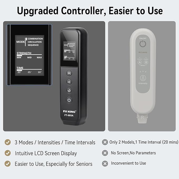 - Easier Operation for Seniors: The FIT KING leg compression machine features a large, intuitive LCD screen controller that displays models, intensities, and timer options for easy selection. With an upgraded zipper design, putting on and taking off our air compression boots is effortless, say goodbye to the troublesome bending over to adjust Velcros or sizes