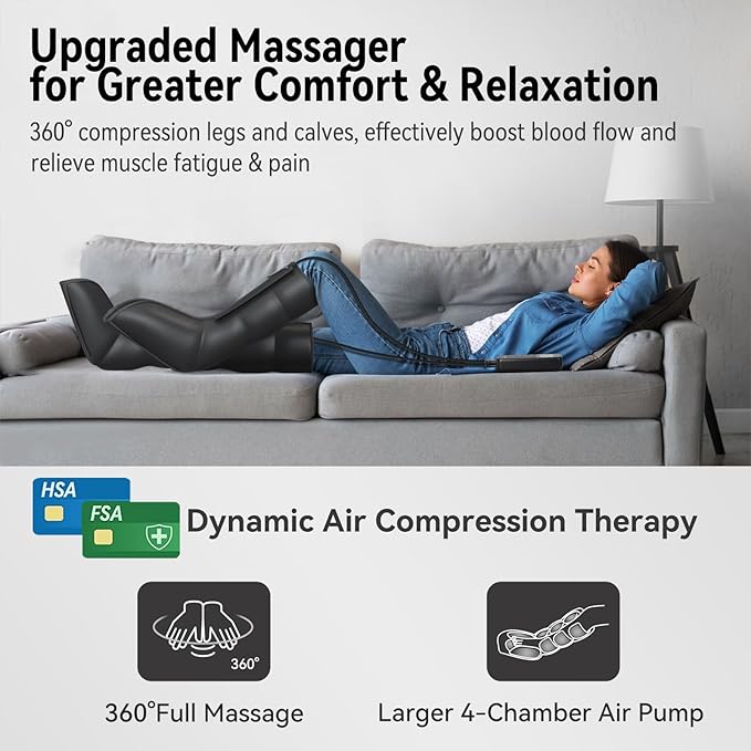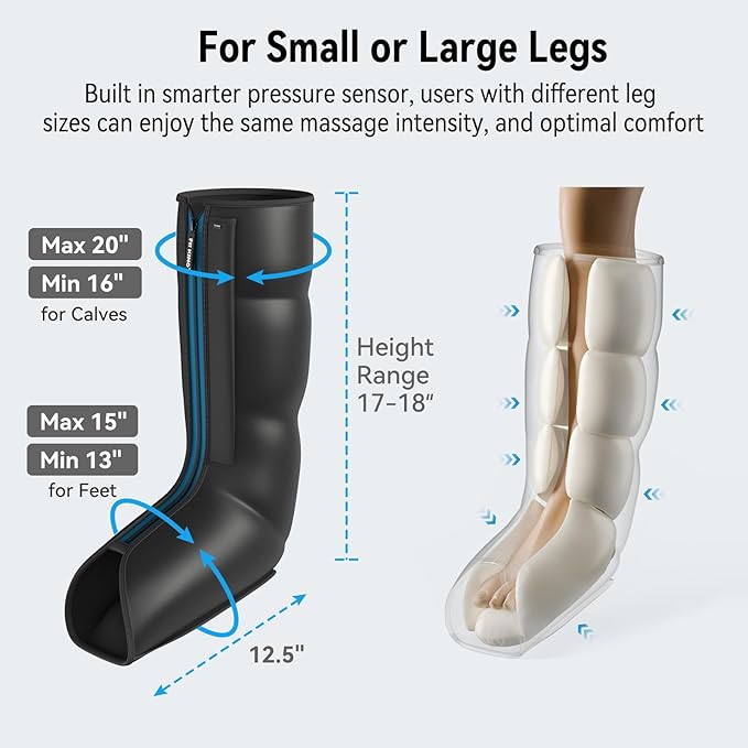 - Suit Whole Family Use: Equipped with advanced pressure sensor technology, our leg circulation machine can automatically precise the pressure to accommodate different leg sizes, ensuring the user's optimal comfort. Refer to the Size Chart, suit small or large, tall or skinny legs. Breathable, sturdy easy-to wipe material ensures simple maintenance for an ultra-long lifespan