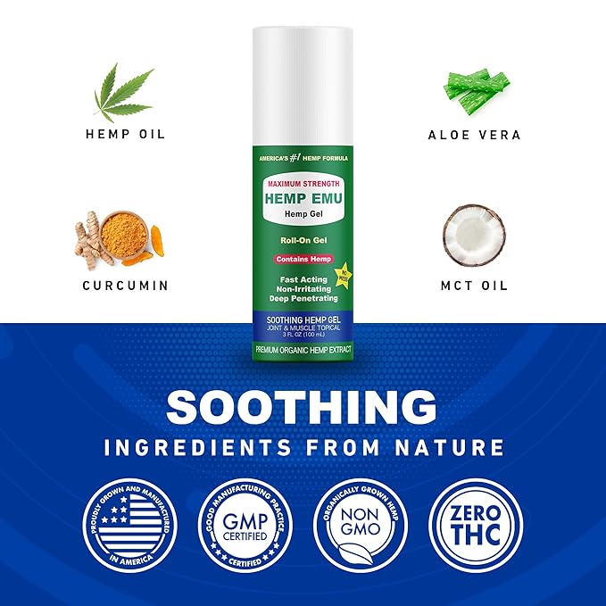 - Discover the Soothing Power of Nature - Elevate your life with Hemp Emu's Hemp Roll-On Gel, a natural solution crafted to provide soothing comfort for muscles and joints. Immerse yourself in the calming embrace of organic hemp seeds oil, pure emu oil, and organic eucalyptus, blended with the refreshing touch of menthol and the gentle nourishment of organic aloe vera. Embrace the natural goodness of these ingredients to alleviate discomfort and rejuvenate your skin. Experience the soothing sensation of organic Hemp Emu, tailored to pamper and revitalize.
