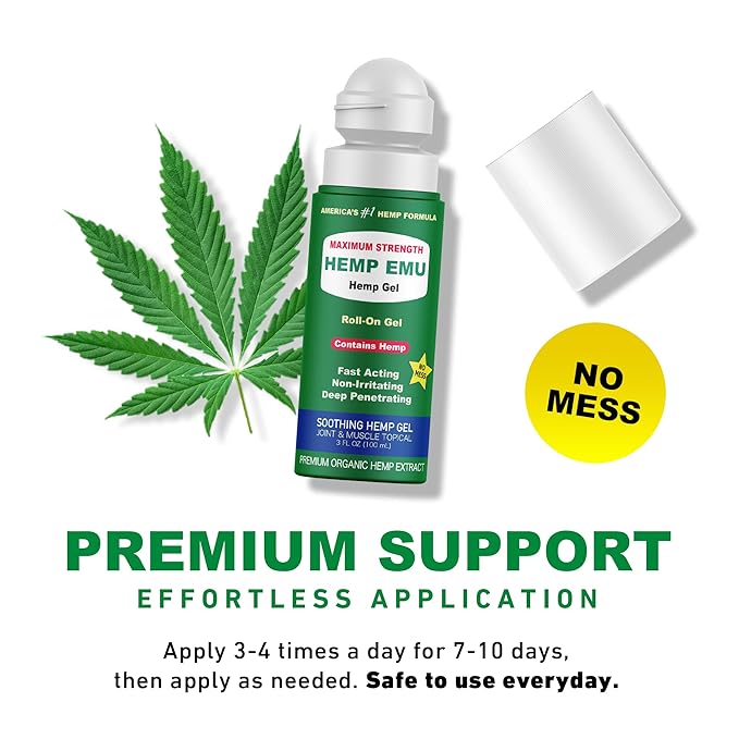 - No Mess Roll On Hemp Oil with Menthol - Hemp Emu's hemp roll on should be your main soothing gel! This hemp gel is made from organic hemp seed oil, emu oil with oleic acid and linolenic acid, eucalyptus, rosemary oil, jojoba oil, peppermint oil, aloe vera, mct oil and organic hemp oil. Our hemp oil salve and muscle rub is great for soothing hip, back joint & muscle discomfort! Our roll on applicator is cleaner and easier than using normal hemp cream, leaving no mess and no discomfort