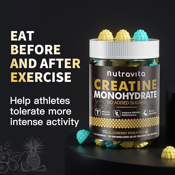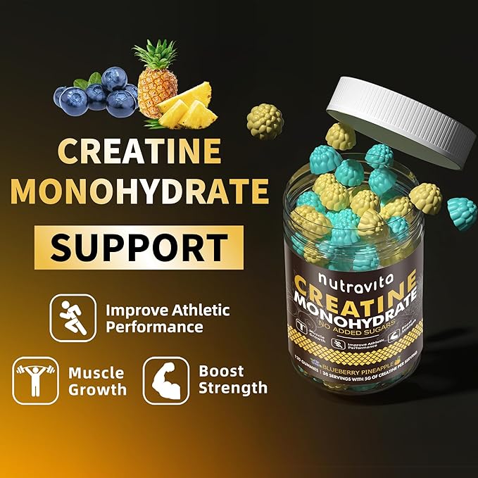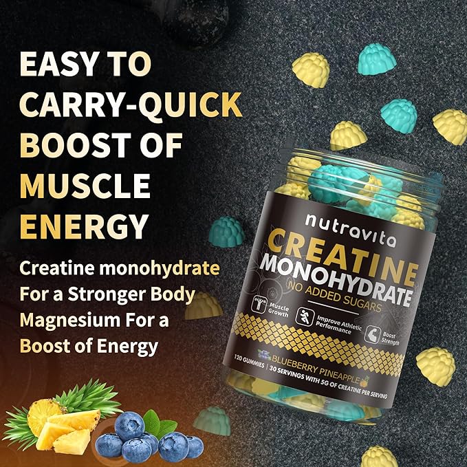 Nutravita Creatine Monohydrate Gummies for Men & Women-5g of Creatine Monohydrate per Serving - Sugar Free,Vegan,Blueberry Pineapple Flavor, 120 Count