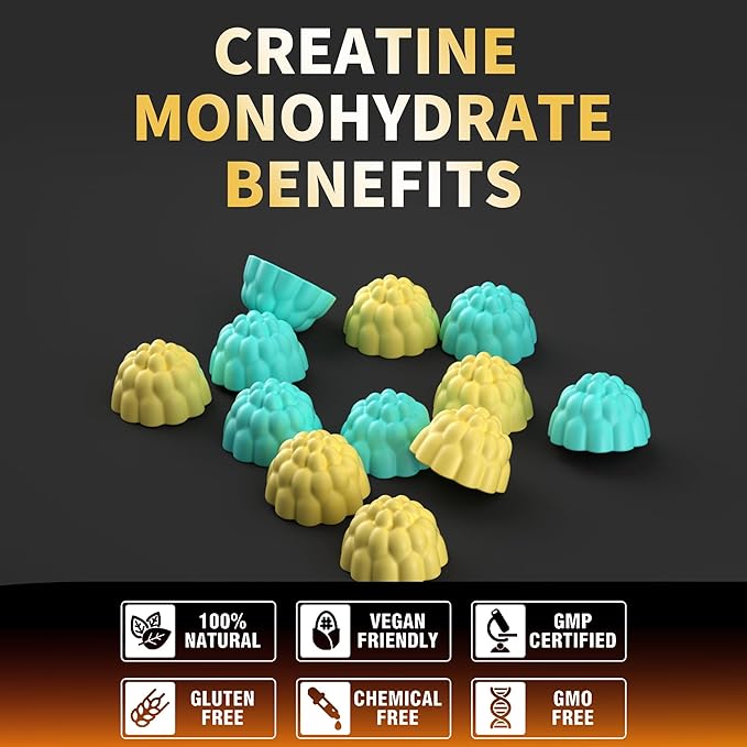 - [ Key Benefits]: Our Creatine monohydrate gummies are an easy way to consume, 3 gummies per serving, you can take it at any time, any place. It improved muscle strength, muscle recovery, improve endurance and energy boost. Suitable for a variety of users, and enjoyable taste.