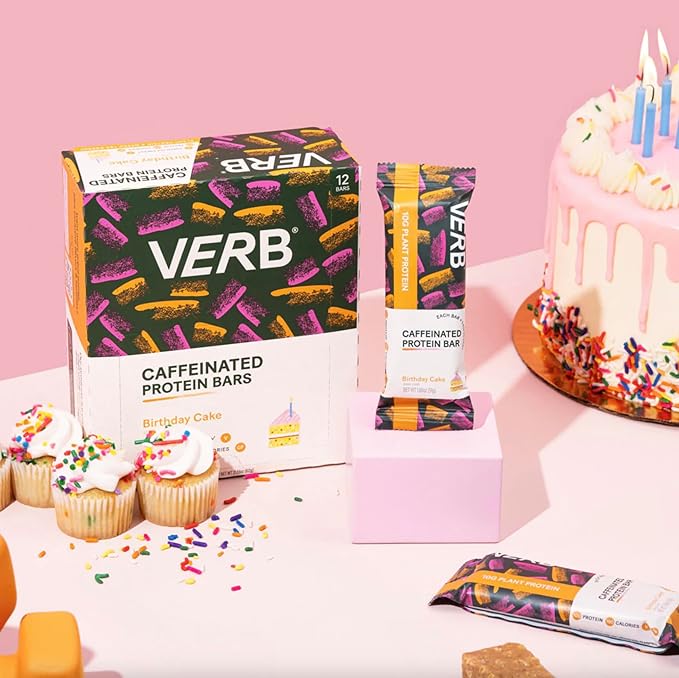 - DELICIOUS BIRTHDAY CAKE PROTEIN BAR: Loved by millions of customers, this is the softest protein bar on the planet! Verb Energy Caffeinated Protein Bars delivers sweet, nostalgic flavor of classic birthday cake with soft, chewy bite. Made with almond butter, agave nectar, and gluten-free oats, a buttery, vanilla-sweet taste, without artificial sweeteners. Unlike other chalky or dry protein bars, our soft-baked texture melts in your mouth, with a slight crisp perfect balance of chew and crunch