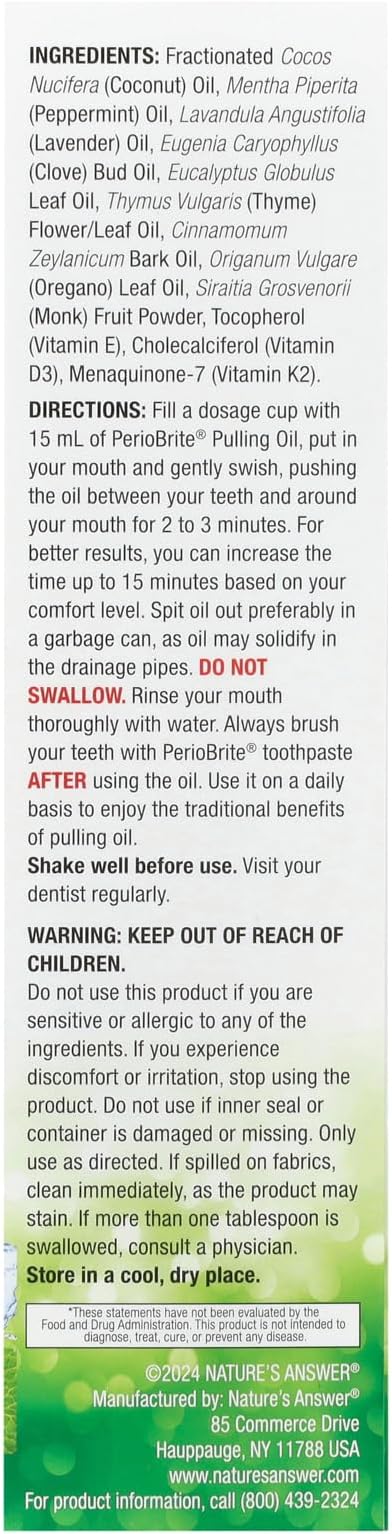 - You can be assured that when you buy a Nature's Answer product you are getting the very best nature has to offer. PerioBrite Coconut Pulling Oil is manufactured only using the cleanest ingredients from around the globe.