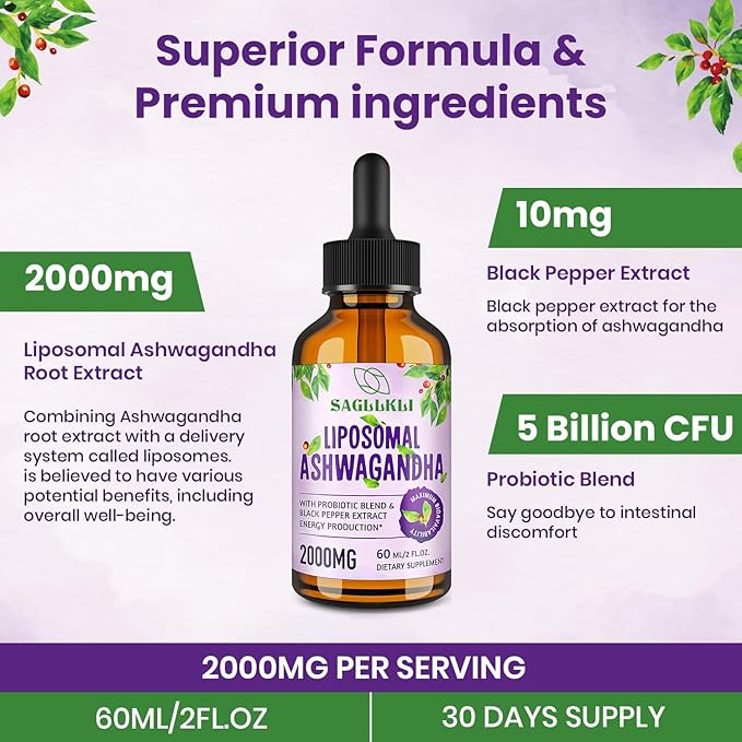 - Premium Ashwagandha with Liposomal Technology:Our Ashwagandha is derived from high-quality plant extracts and is completely free from wheat, gluten, soy, sugar, artificial additives, and colors. Our formula is rigorously tested for purity and potency. Unlike traditional Ashwagandha capsules, it's available in a fast-absorbing liquid form with liposomal technology, ensuring better bioavailability and convenience. Packaged in a 60ml (2.0 fl. oz) bottle, it delivers a full month’s supply for daily use