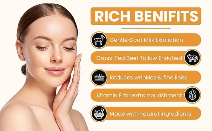 - Sustainable & Gentle Exfoliating Lotion: Our organic tallow lotion combines sustainability with gentle exfoliation, using ingredients sourced from grass-fed cattle and goats. This not only ensures the purity and effectiveness of our product but also reflects our commitment to environmental responsibility.