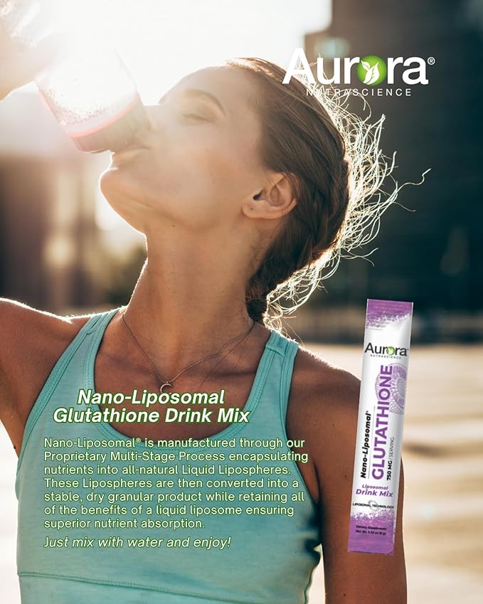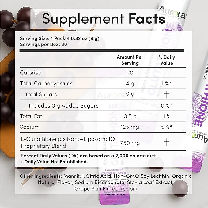 Aurora Nutrascience Nano-Liposomal Glutathione, Grape Powdered Drink Mix Immune & Antioxidant Gut Health Support Supplement, 750 mg per Serving, Non-GMO, Sugar-Free, 30 Single Serve Packets
