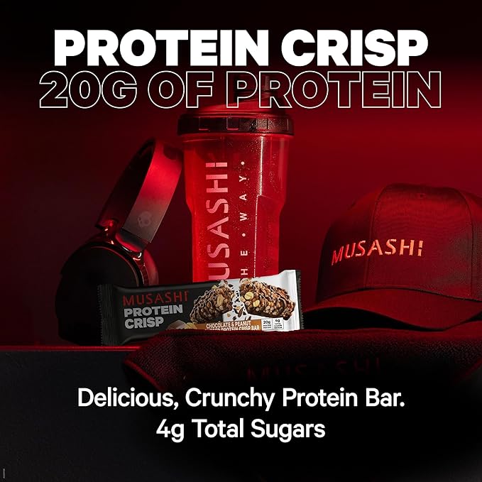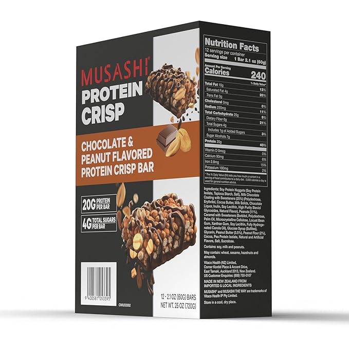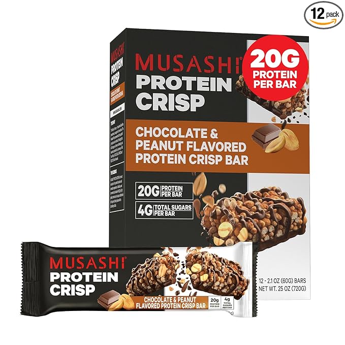 MUSASHI Protein Crisp Bar, 20g Protein, 4g Total Sugars, Chocolate & Peanut, Post Workout and Snack On The Go, 12 Pack of 2.1oz (60g) Bars