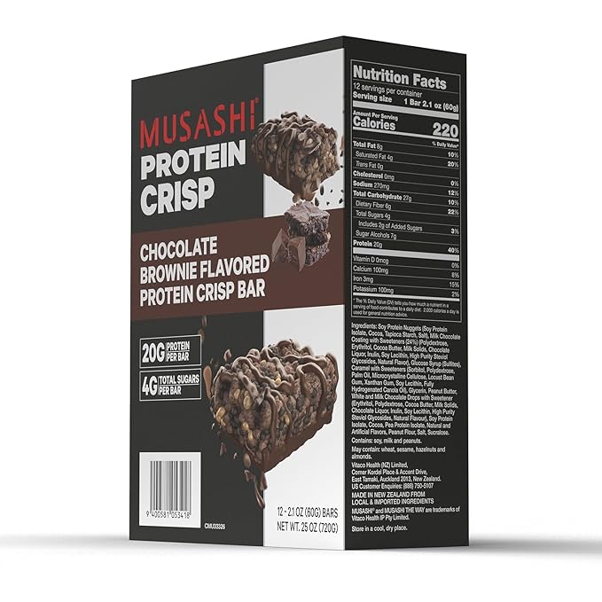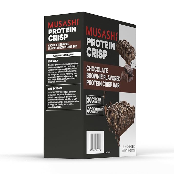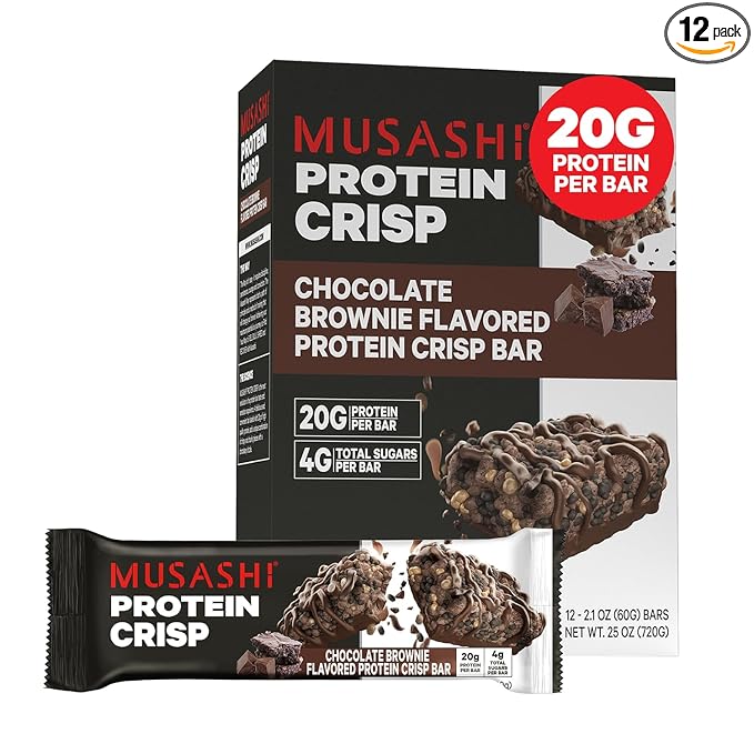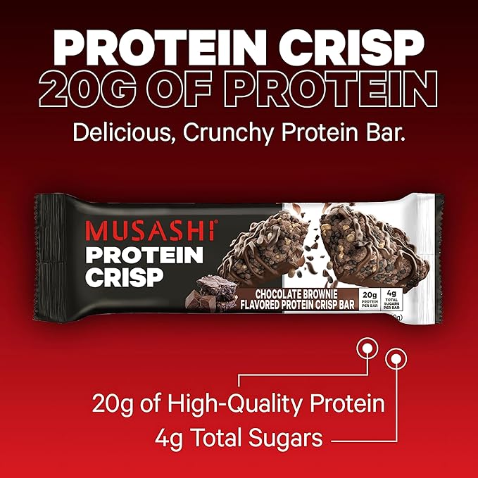 MUSASHI Protein Crisp Bar, 20g Protein, 4g Total Sugars, Chocolate Brownie, Post Workout and Snack On The Go, 12 Pack of 2.1oz (60g) Bars