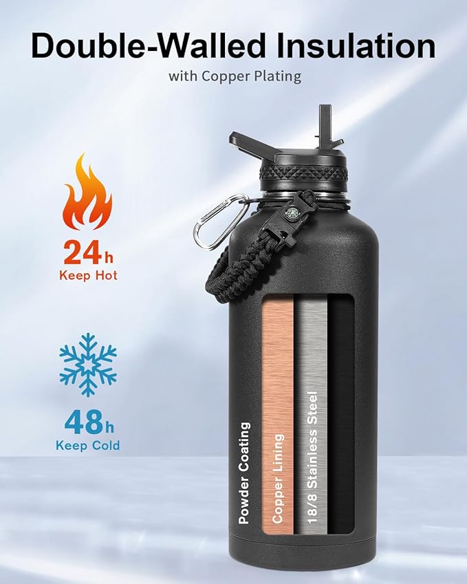 Trebo Water Bottle 87 oz with Paracord Handle, Double Wall Vacuum Stainless Steel Insulated Water Jug (Keep Cold 48hrs),Leakproof Flask For Hot Drinks with Straw Spout Lids, Black