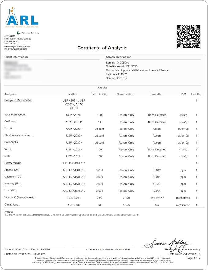 - High Quality: Our glutathione powder sticks are vegan and sugar-free. Produced in a cGMP-certified facility, each batch is verified with CryoTEM for liposome presence and undergoes third-party testing to ensure purity and potency. We uphold the highest standards of safety.
