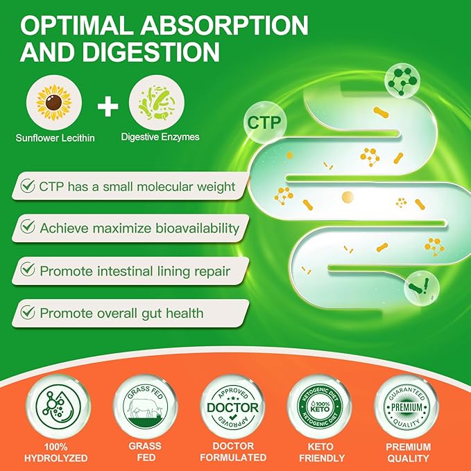 - BSORPTION IS THE KEY TO COLLAGEN INTAKE - Collagen Tripeptide (CTP) has a small molecular weight, which allows to be absorbed faster by intestines. It also contains a digestive enzyme & sunflower lecithin to further optimize bioavailability. This clever combination also promotes intestinal lining repair & overall gut health. Our collagen powder dissolves quickly without clumping. You can add it to your favorite drink or smoothie, or add it to your recipes.