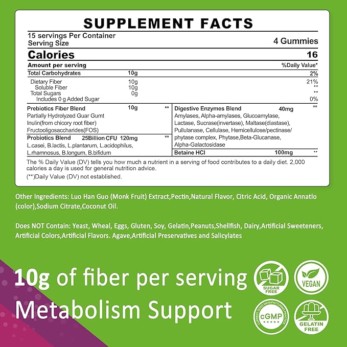Fiber Gummies for Adults, Sugar Free 10g Prebiotic Fiber Supplement with Digestive Enzymes, Probiotics & 100mg Betaine for Digestive & Gut Health and Regulate Bowel Movement, Vegan, Gelatin Free,120ct