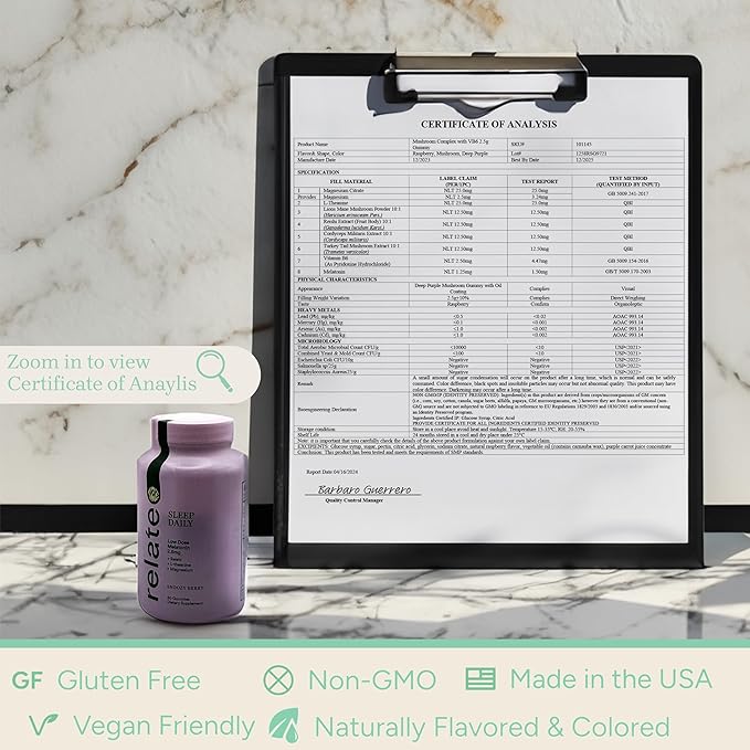 Relate Sleep Daily Gummies - Mushroom-Infused Sleep Support with Low-Dose Melatonin, Magnesium, L-Theanine, Lion's Mane, Reishi, Cordyceps, and Turkey Tail Mushrooms - Vegan, Made in USA - 60 Count