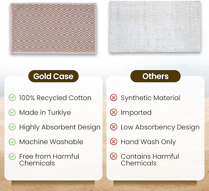 - LUXURIOUS TURKISH COMFORT: Our set of 2 washable bathroom rugs, made from 100% recycled Turkish cotton, offer plush comfort. Our non slip bath mats for bathroom are ideal for families and seniors, in 16x24 and 20 x 32 inches, feature a unique weave for added comfort and a reduced carbon footprint.