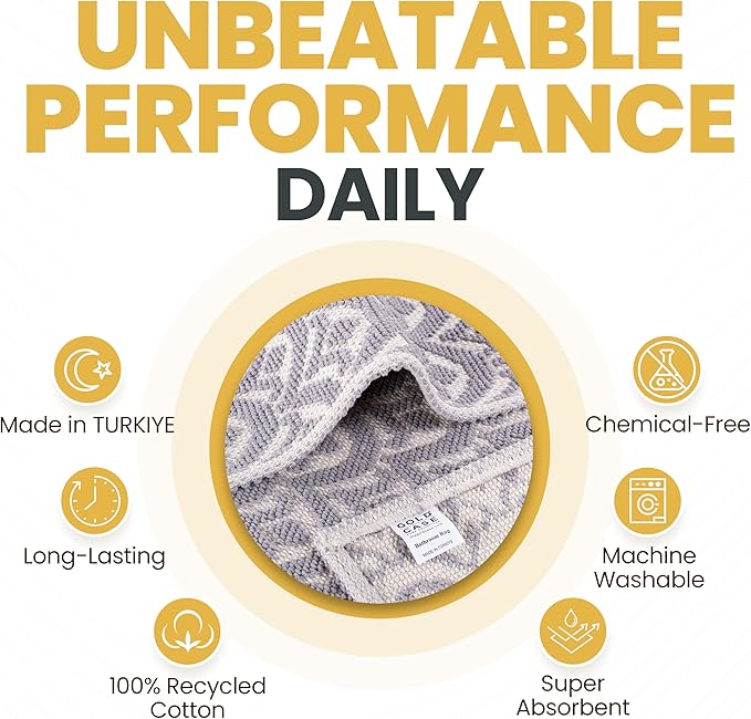 • LUXURIOUS TURKISH COMFORT: Our set of 2 washable bathroom rugs, made from 100% recycled Turkish cotton, offer plush comfort. Our non slip bath mats for bathroom are ideal for families and seniors, in 16x24 and 20 x 32 inches, feature a unique weave for added comfort and a reduced carbon footprint.